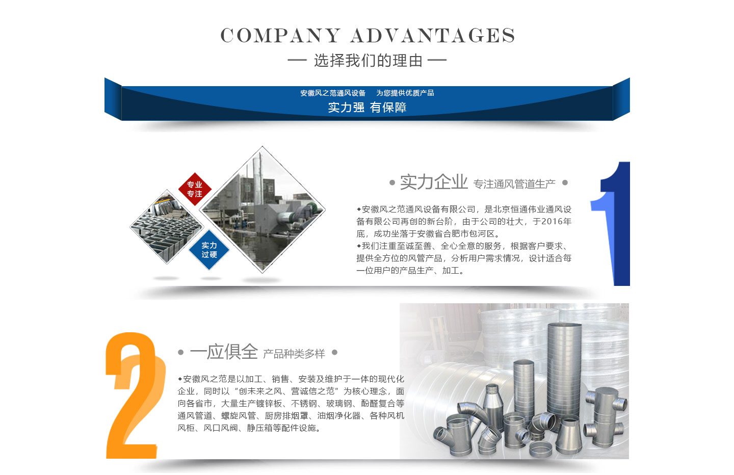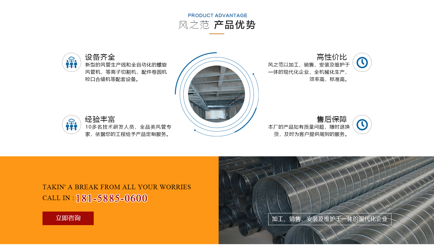 安徽風之范通風設備有限公司,是北京恒通偉業通風設備有限公司再創的新臺階,多年來,公司員工憑著“誠信敬業、團結拼搏、勇于開拓、務實進取”的企業精神,先后承接了多項重點工程項目,使公司健康穩步發展。現由于公司的壯大,業務的拓展,又于2016年底,成功坐落于安徽省合肥市包河區。本公司生產設備精良,技術力量雄厚,質保體系完善!讓用戶體驗到,貼心的服務,無憂的售后!風之范是以加工、銷售、安裝及維護于一體的現代化企業,同時以“創未來之風、營誠信之范”為核心理念,面向全國各省市,大量生產鍍鋅板、不銹鋼、玻璃鋼、酚醛復合等通風管道、螺旋風管、廚房排煙罩、油煙凈化器、各種風機風柜、風口風閥、靜壓箱等配件設施。廣泛承接商場、工廠、酒店、寫字樓、地下室等,消防排煙工程、除塵凈化工程、室內通風工程、暖通空調工程、廚房排煙凈化工程。我們力求上進,追求,歡迎各界人士技術指導,經濟合作,共創美好明天!